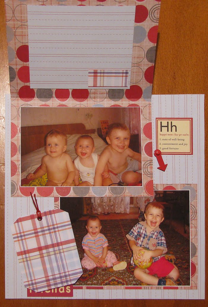 Фотографии были все разрозненные, просто запечатлены отдельные мгновения жизни. Поэтому страницы в развороты оформляла не по теме, но всё же старалась как-то объединить. Например, один разворот посвящен сыну, другой - дочке, третий - об обоих детях и т.д. Сразу хочу сказать, что фотографий будет очень много. Буду показывать разворот целиком, а затем каждую страничку отдельно. Некоторые странички я уже выкладывала, участвуя с ними в заданиях. Поэтому детали показывать не буду, а дам ссылку на эту страничку. В принципе, ничего особенного я не сделала, поэтому и деталей будет немного. Итак, начинаю показ.